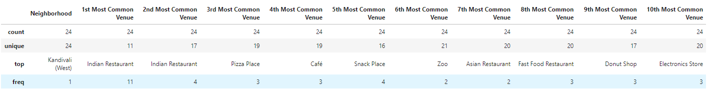 It wasn’t surprising to see that the most frequently visited venues was Indian Restaurants. However, this data did not reveal that these restaurants were Fine Dine places. It wasn’t very conclusive if these restaurants provided only comfort food, local food or did any of these actually provide a Fine Dine experience.