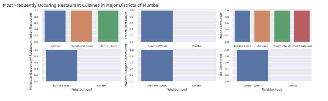 Based on the data analysis performed on the major districts of Mumbai, to arrive at a conclusion of the business goal to open a fine dining restaurant in Mumbai, the data exploration was done on types of restaurants e.g. Indian, French, Chinese, Mediterranean in some of the major districts of Mumbai like Bandra, Khar/Santacruz, Colaba, Marine Lines and Borivali (West).