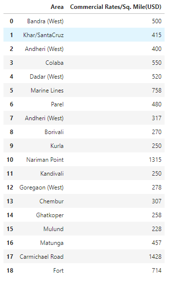 The second set of data which I have used is to provide the property prices of Commercial land in Mumbai to identify which place would be economical from an infrastructure perspective.