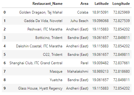 During my analysis, some of the Fine Dine websites suggested that the following restaurants were the 10 most expensive restaurants in Mumbai. So, we should look at other major areas to open a new Fine Dine restaurant which could be in this league of restaurants.