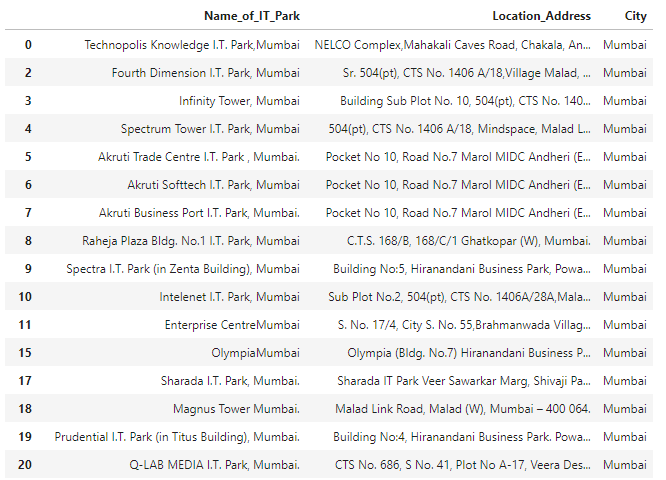 One of the challenge was that the address for these IT/ITES parks was not standardized and was in a free text format. Thus, the city name and area had to be extracted by use of regular expressions.